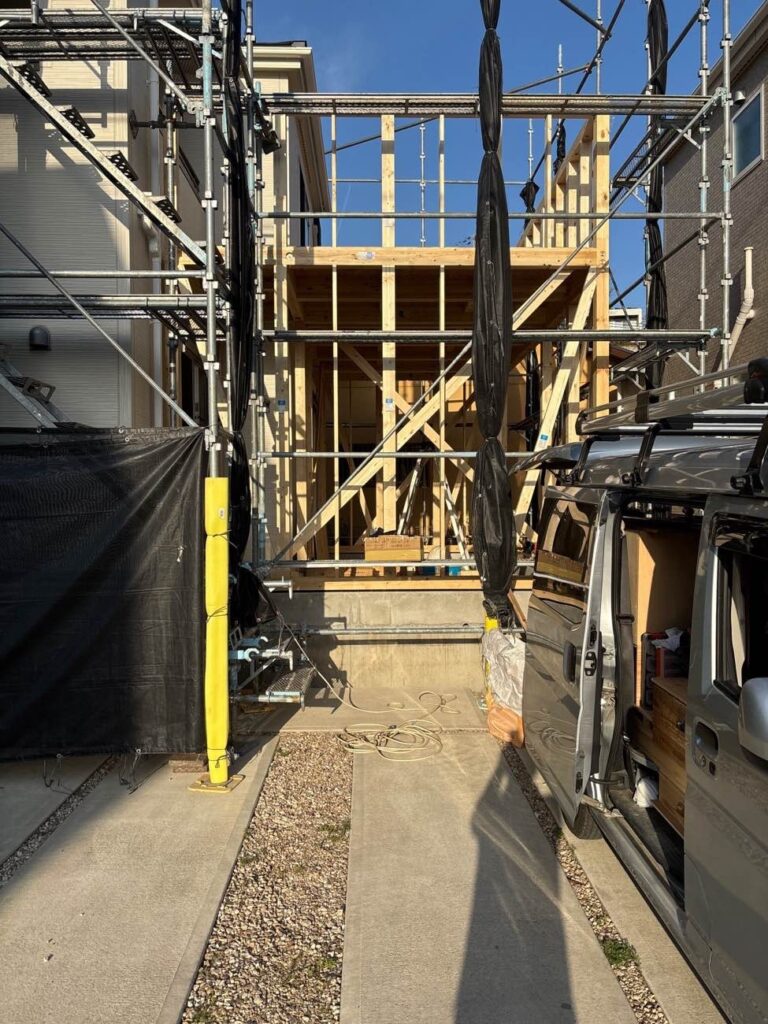 今回は足場作り・上棟・ベランダ部分の施工です。