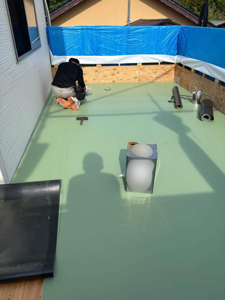 ※ FRP防水とは、液状の不飽和ポリエステル樹脂に硬化剤を加えて混合し、この混合物をガラス繊維などの補強材と組み合わせて一体にした塗膜防水です。従って出来上がった防水層は、継ぎ目のないシームレスな層となり、優れた防水性能を発揮します。