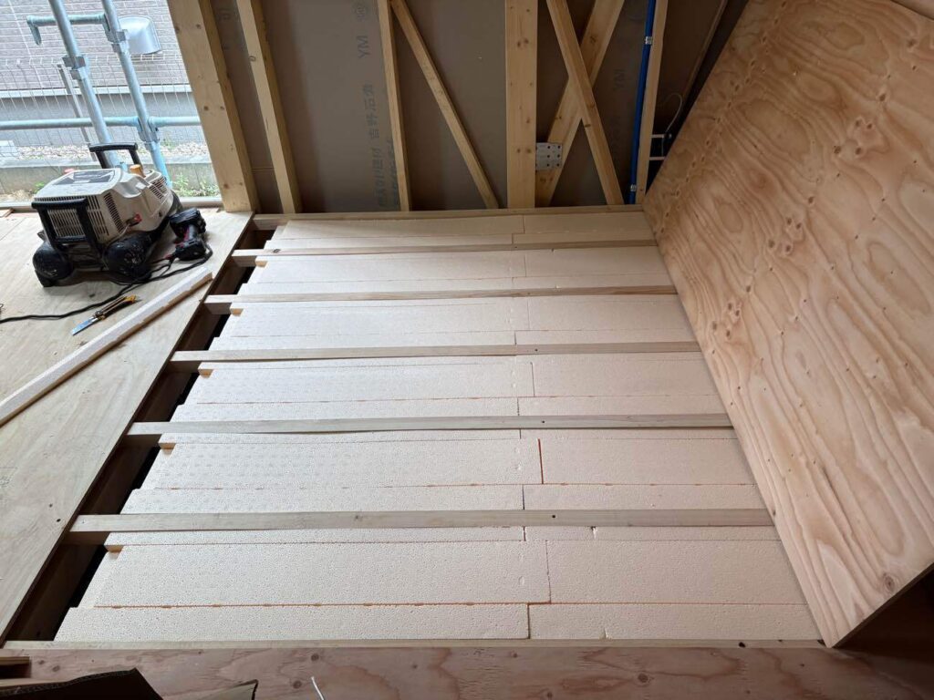 床には断熱材を敷き詰め、断熱性を高めておきます。